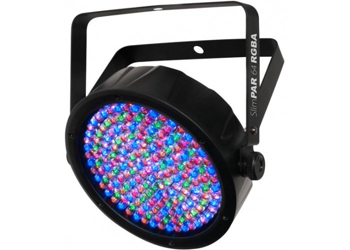 CHAUVET Slim Par 64 RGBA светодиодный прожектор направленного света. 180х10мм. светодиодов (39R+39G+51B+51A), управление 4/8 каналов DMX, угол раскрытия 14град, угол засветки 23град, освещенность 1325lux(2м), возможность параллельного эл.подключения до 60 приборов, универсальный блок питания 100-240В, потребление до 33Вт, вес 1,3кг, ДШВ 276х275х66мм.