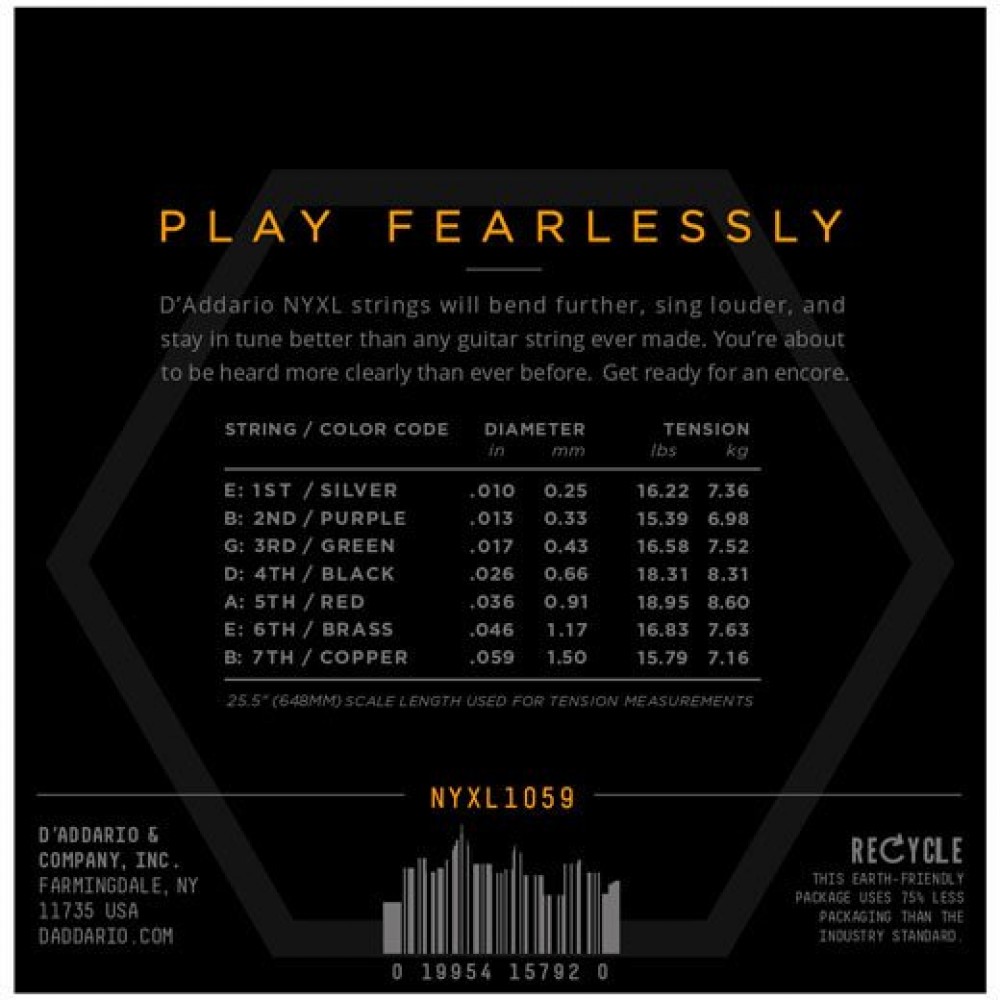 Струны D’Addario NYXL гибче, громче и держат строй лучше, чем все другие струны на которых вы играли. Разработанные, оформленные и изготовленные в Нью-Йорке, эти новые струны с высокоуглеродистым сердечником и стальным сплавом простых струн открывают вам целый мир свободы, мощи и уверенности. Струны NYXL прочнее и до 131% стабильнее, благодаря использованию новой технологии волочения проволоки и революционному процессу “fusion twist” для изготовления стальных струн без оплетки. Новая формула никелевого покрытия обладает лучшими магнитными свойствами, а значит струны звучат громче, частотная характеристика расширена для большего присутствия и кранча.