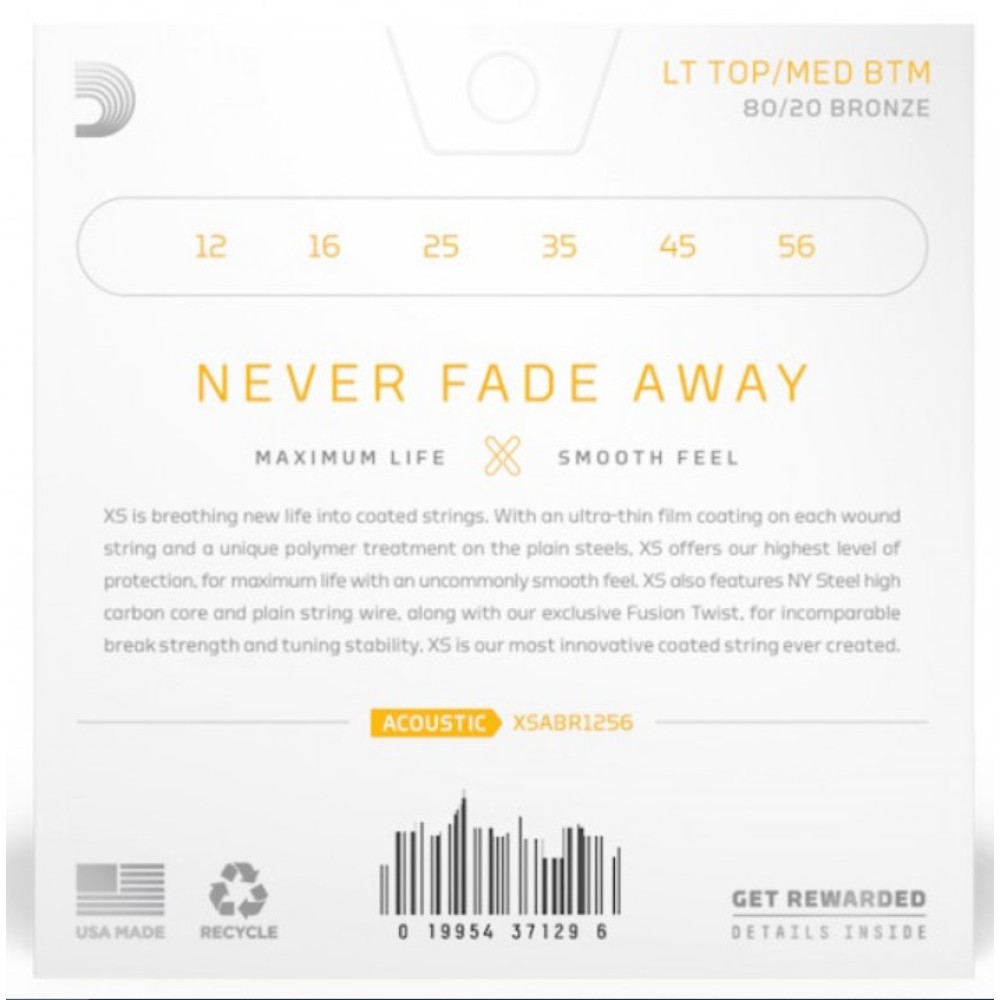 Комплект струн для акустической гитары D'Addario XSABR1256 серии XS, состав бронза 80/20, размер 12-56