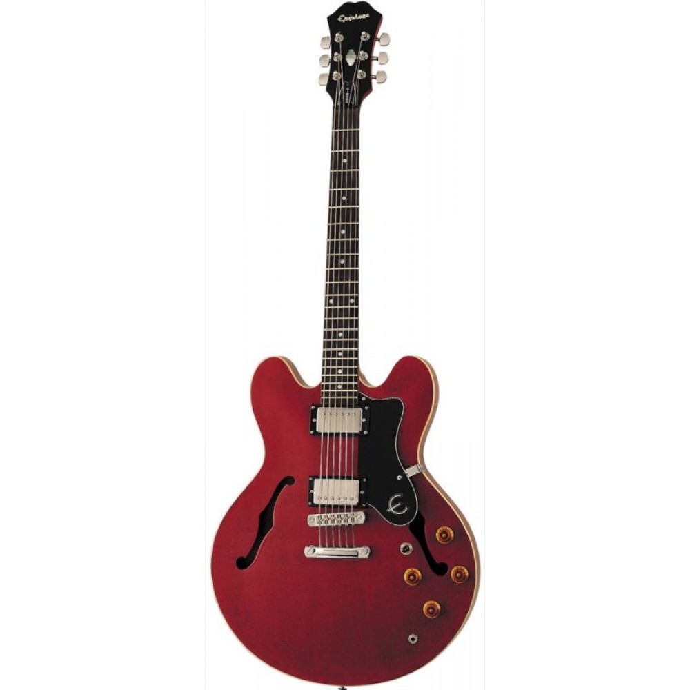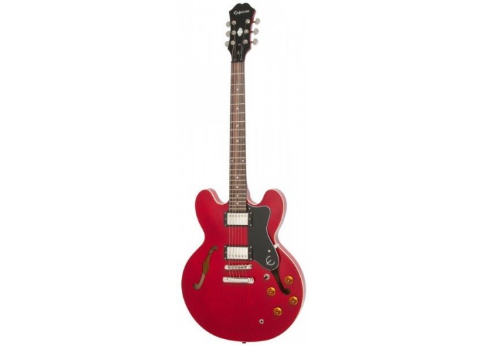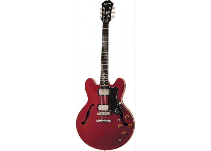 EPIPHONE DOT CHERRY CH Электрогитара полуакустическая, цвет вишня , корпус ламинированный клён, вклееный гриф махогон, накладка грифа палисандр, инкрустация в виде точек, мензура 24,75", ширина верхнего порожка 42 мм, звукосниматели H-H, регулировки - 2 громкости, 2 тона, 3х-поз.переключатель, фурнитура - хром, бридж - Tune-o-Matic.