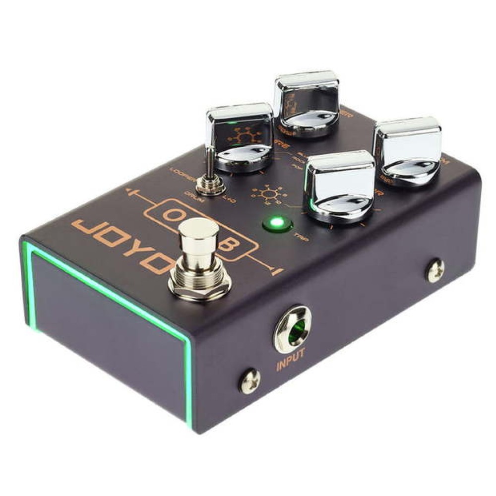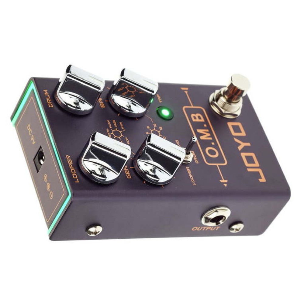 В режиме лупер есть функция автоматического выравнивания и функция отсчета для первой записи. Максимальное время записи - 40 минут. В режиме драм-машины вы можете выбрать 7 жанров ударных с 7 различными битами в каждом. Темп можно задавать с помощью кнопки Tap Tempo, LED индикатор мигает в такт. O.M.B синхронизирует ваш луп с грувом барабанов. Стили ударных – поп, рок, блюз, метал, панк, джаз и латино-американский. Серия Revolution от JOYO – это 4 поколение гитарных эффектов. 3 режима светодиодной подсветки можно переключать с помощью переключателя на задней части педали.