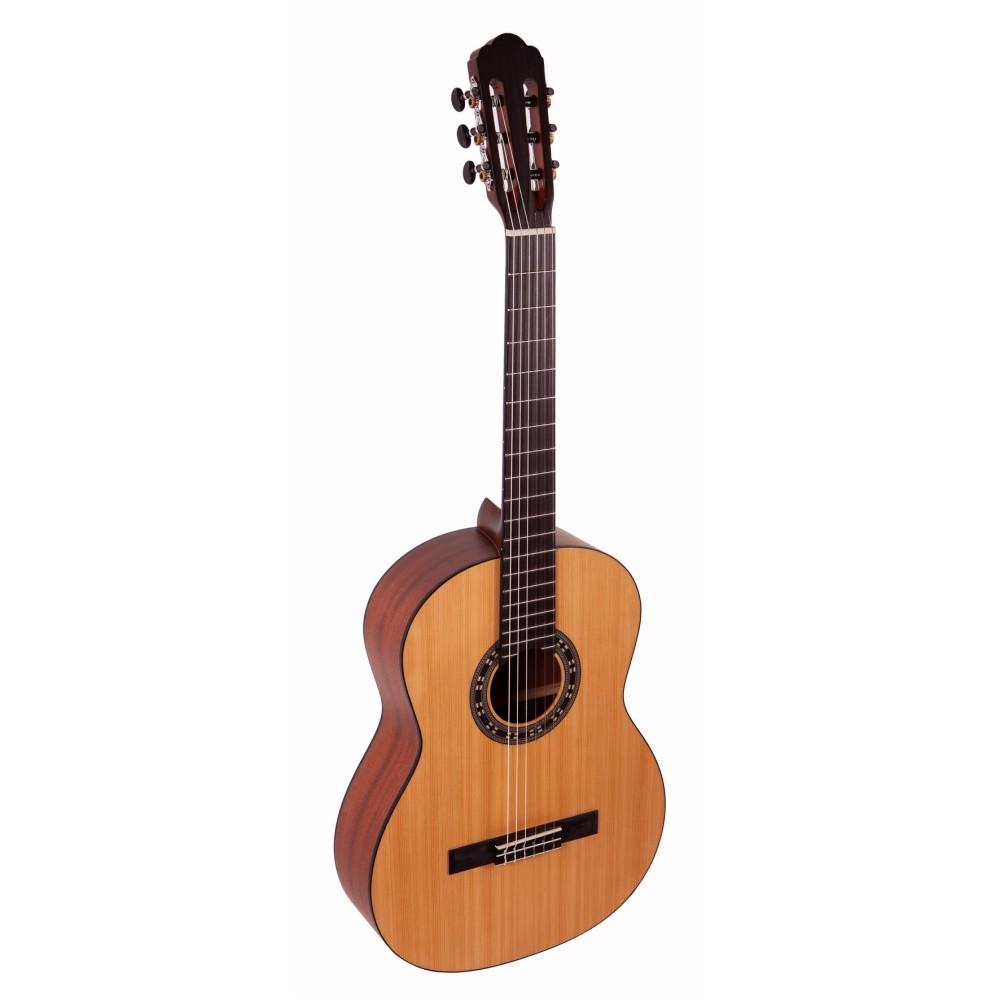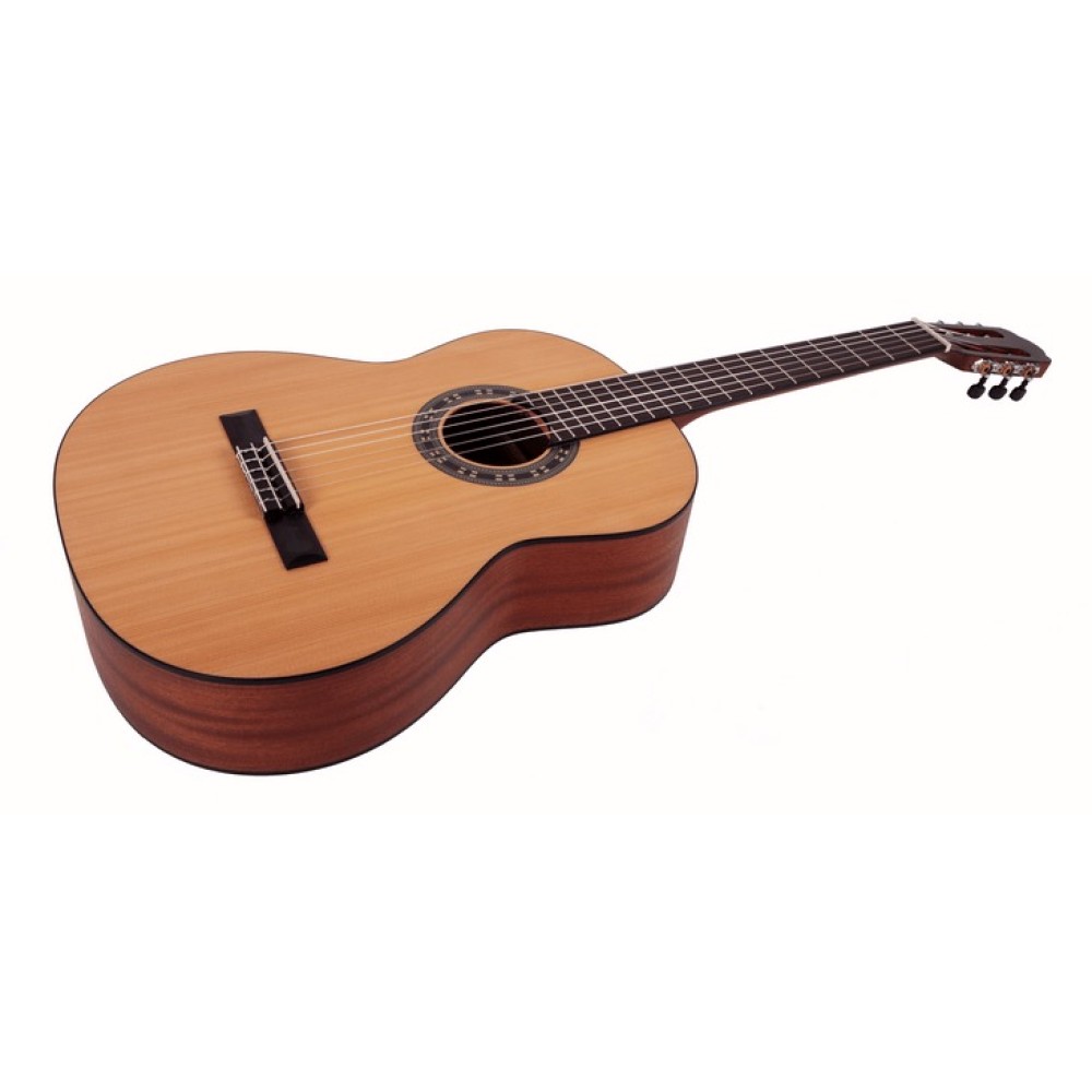 Классическая гитара LA MANCHA Granito 32 имеет размер 4/4, матовую отделку топа с открытыми порами и струны Savarez. Верхняя дека этого инструмента выполнена из ели, нижняя дека и обечайки – красное дерево. Длина мензуры 65 см, сам гриф выполнен из махагона и дополнен накладкой из овангкола, древесины родом из Африки, которая по своим характеристикам похожа на более популярную бубинга. Данная модель гитары представлена в трёх вариантах цвета (натуральный, состаренный коричневый, тёмный санбёрст) и имеет чёрную окантовку из АБС пластика