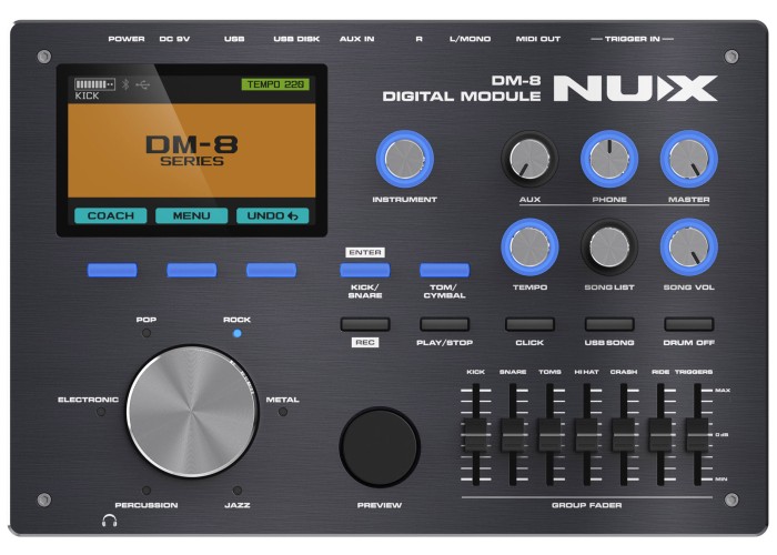 Новый звуковой модуль DM-8 наполнен инновационными и привлекательными функциями, включая групповые фейдеры, которые назначают уровни звука для каждого отдельного пэда. Легко создавайте свои собственные барабанные миксы! Также в комплект входят 30 наборов высококачественных барабанных установок с разными стилями. Независимо от стиля барабана, вы можете получить от него желаемое звучание. Интуитивно понятные и мощные функции настройки звука позволяют пользователям свободно редактировать свои собственные наборы ударных. Вы можете назначить любой звук на обод или пластик.